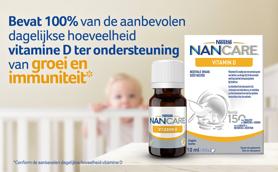 NANCARE Vitamine D is een vitamine D-supplement zonder suiker, smaakstoffen of additieven, met als enige ingrediënten vitamine D en zonnebloemolie. Dit supplement werd speciaal ontwikkeld voor baby’s en jonge kinderen en bevat de aanbevolen hoeveelheid vitamine D voor een goede botontwikkeling en immuniteit van je baby. Twee druppeltjes per dag volstaan, maar het aantal druppels mag worden aangepast op advies van je gezondheidsspecialist.